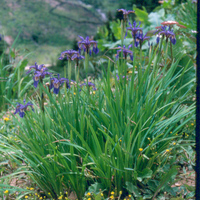 These irises are usually used in damp places and bog gardens, but they grow well also in drier places. They make robust clumps of long, narrow leaves, and the stems of narrow-petalled flowers stand up well above the foliage. There are just a few species, but many selected varieties. Iris delavayi is the largest of the species in this group, and this is an outstanding form, robust, up to 2 metres tall, with large, deep purple flowers, quickly forming a good clump of strong shoots.